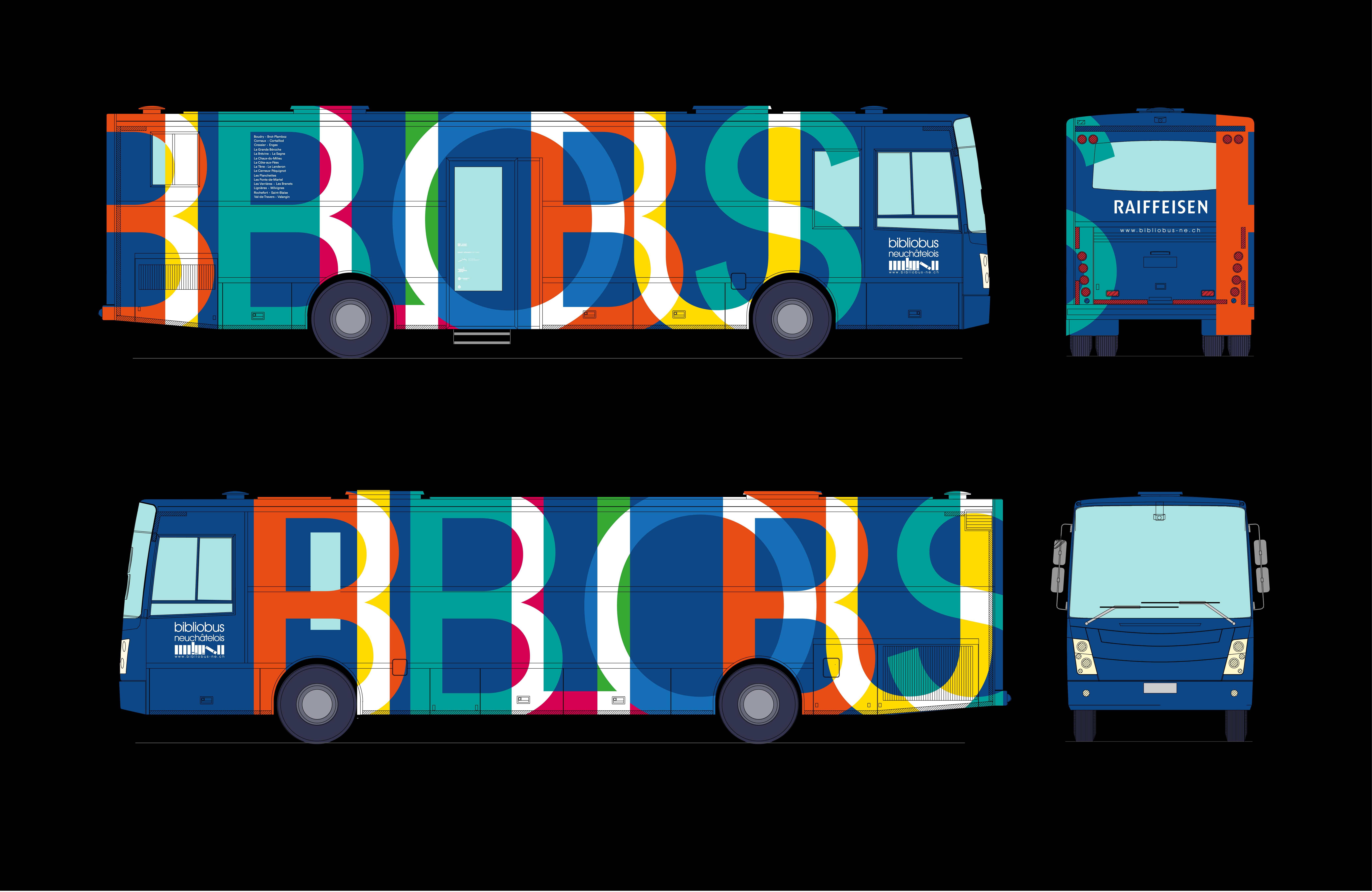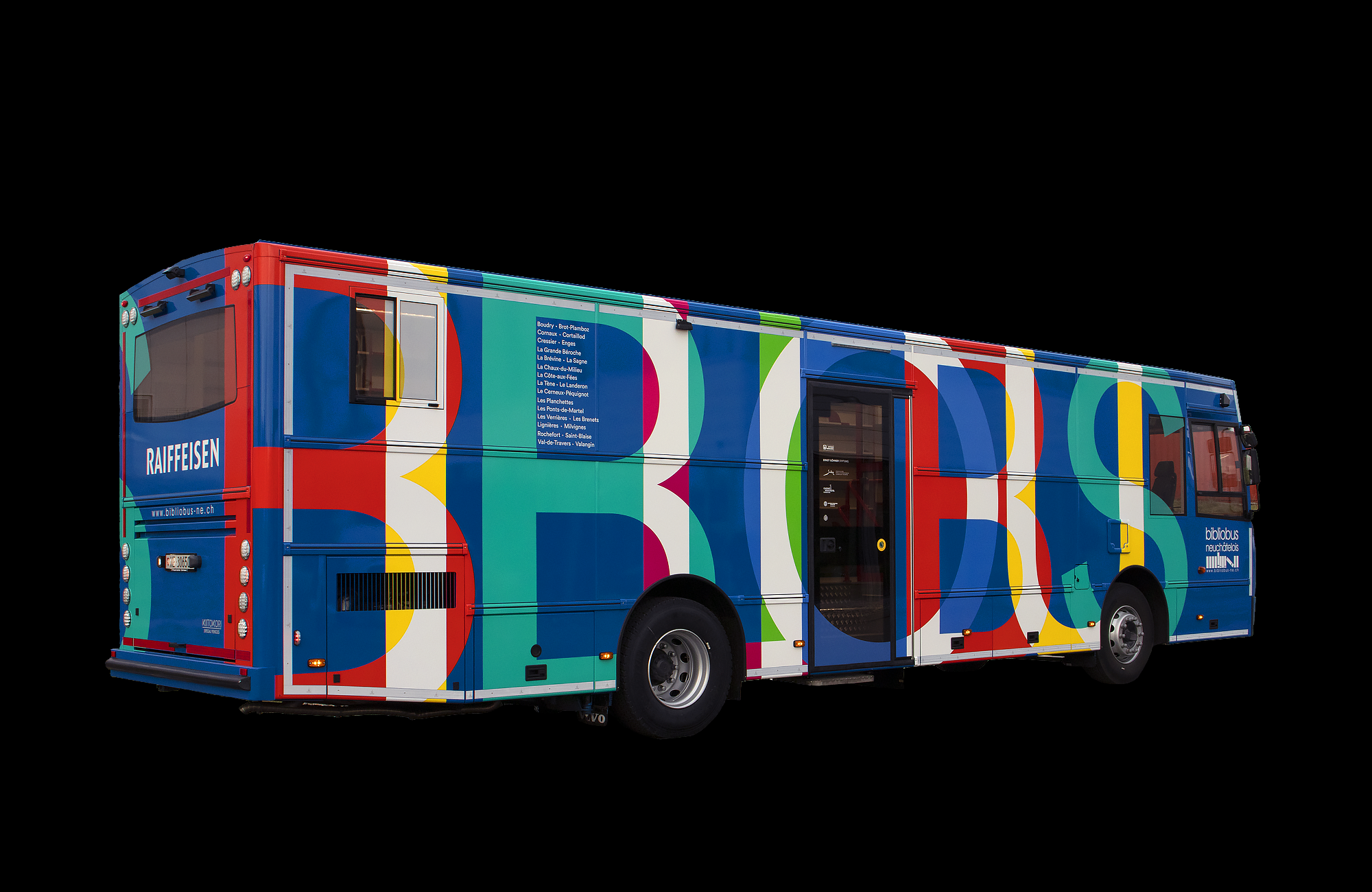 Réalisation du nouveau covering pour le Bibliobus du canton de Neuchâtel. Le concept est basé sur la typographie et la colorimétrie. La verticalité des lettres reflète la disposition des livres sur les étagères et leur polychromie renvoie à la diversité des thèmes et des médias que l’on trouve à l’intérieur de cette bibliothèque itinérante.