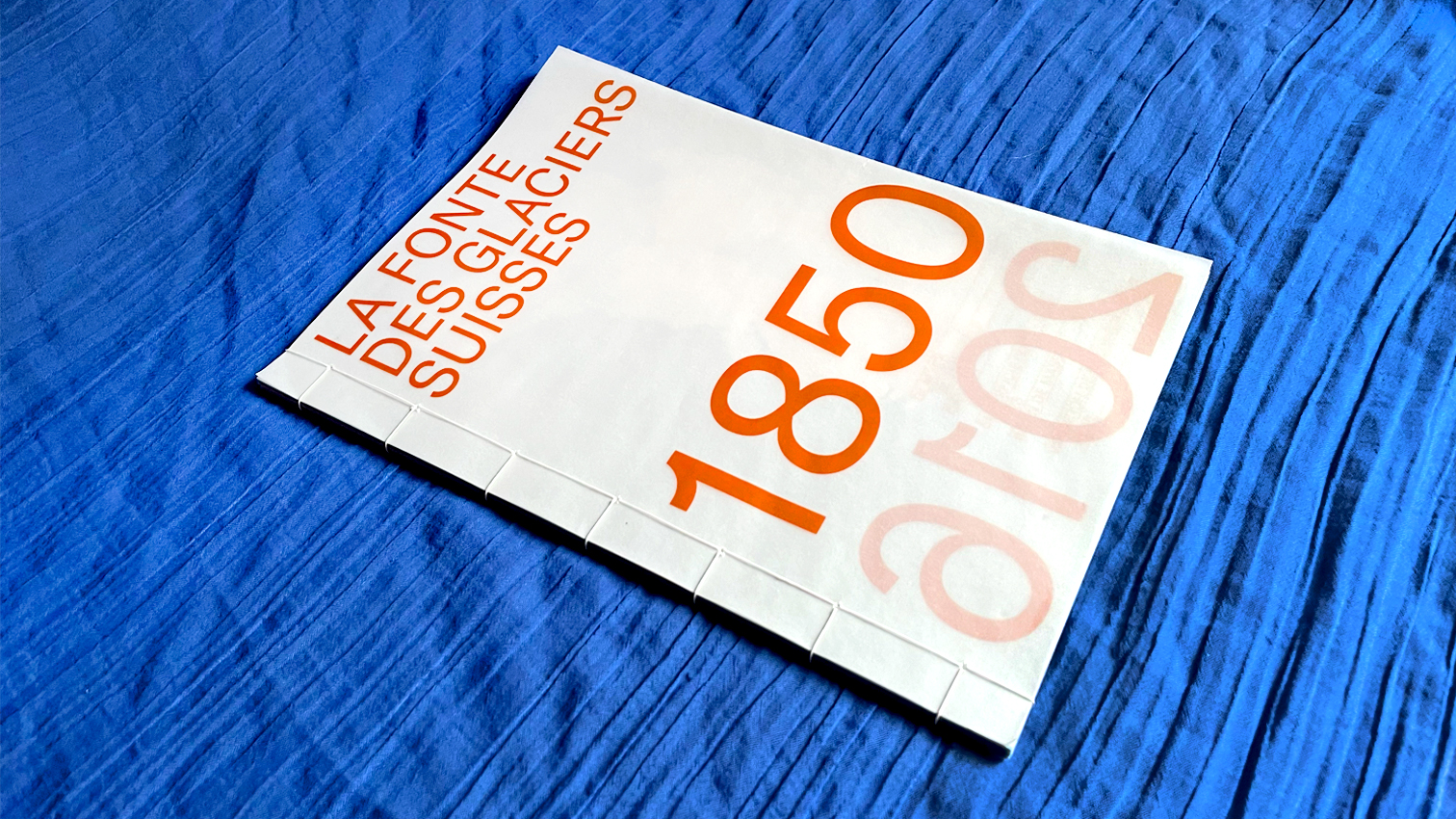 Cette publication illustre la fonte d’une sélection de glaciers suisses entre 1850 et 2016. Par le biais d’un papier-calque transparent, on retrouve la superposition de la superficie des glaciers de 1850 et de 2016. Ce travail a été réalisé dans le but de retranscrire visuellement et non par des chiffres, l’urgence climatique qui frappe sur nos glaciers.
