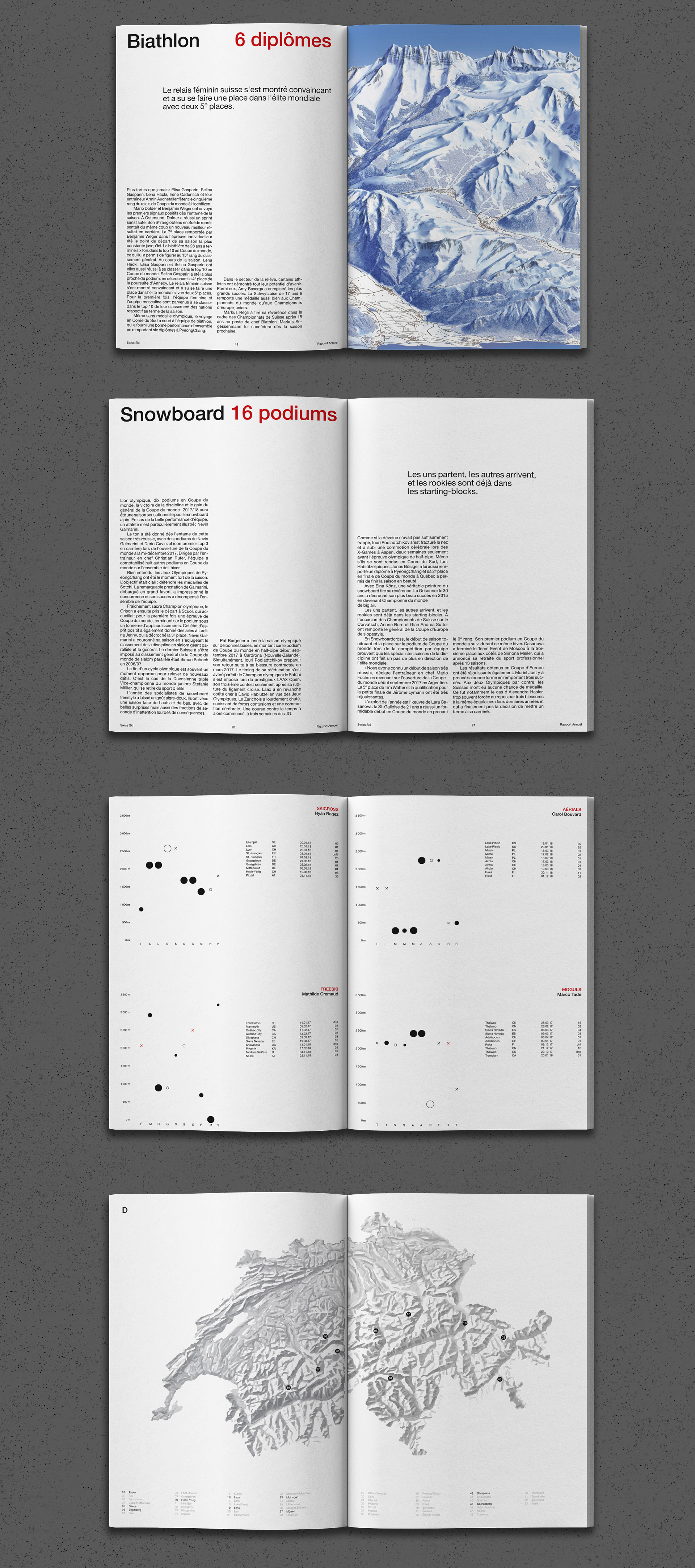 Rapport annuel de l’année 2018 pour l’association Swiss Ski. Le book analyse les lieux de compétitions, diverses statistiques, des illustrations de plans des pistes de ski et des prises de vue aériennes.